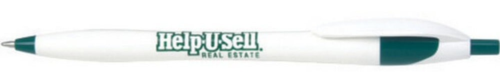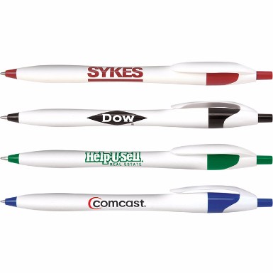 Using this classic promotional ballpoint is a great step in the "write" direction! This click-action pen features a uniquely shaped body that fits comfortably in customer's hands. The great colored accents highlight the white barrel and your imprinted logo, name or custom design. It's also equipped with guaranteed ultra-smooth writing blue or black ink cartridge (default ink is blue).