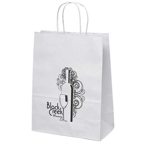 Jenny-White Paper Shopper Bag. White kraft paper shopper with matching twisted paper handles and serrated cut top.
