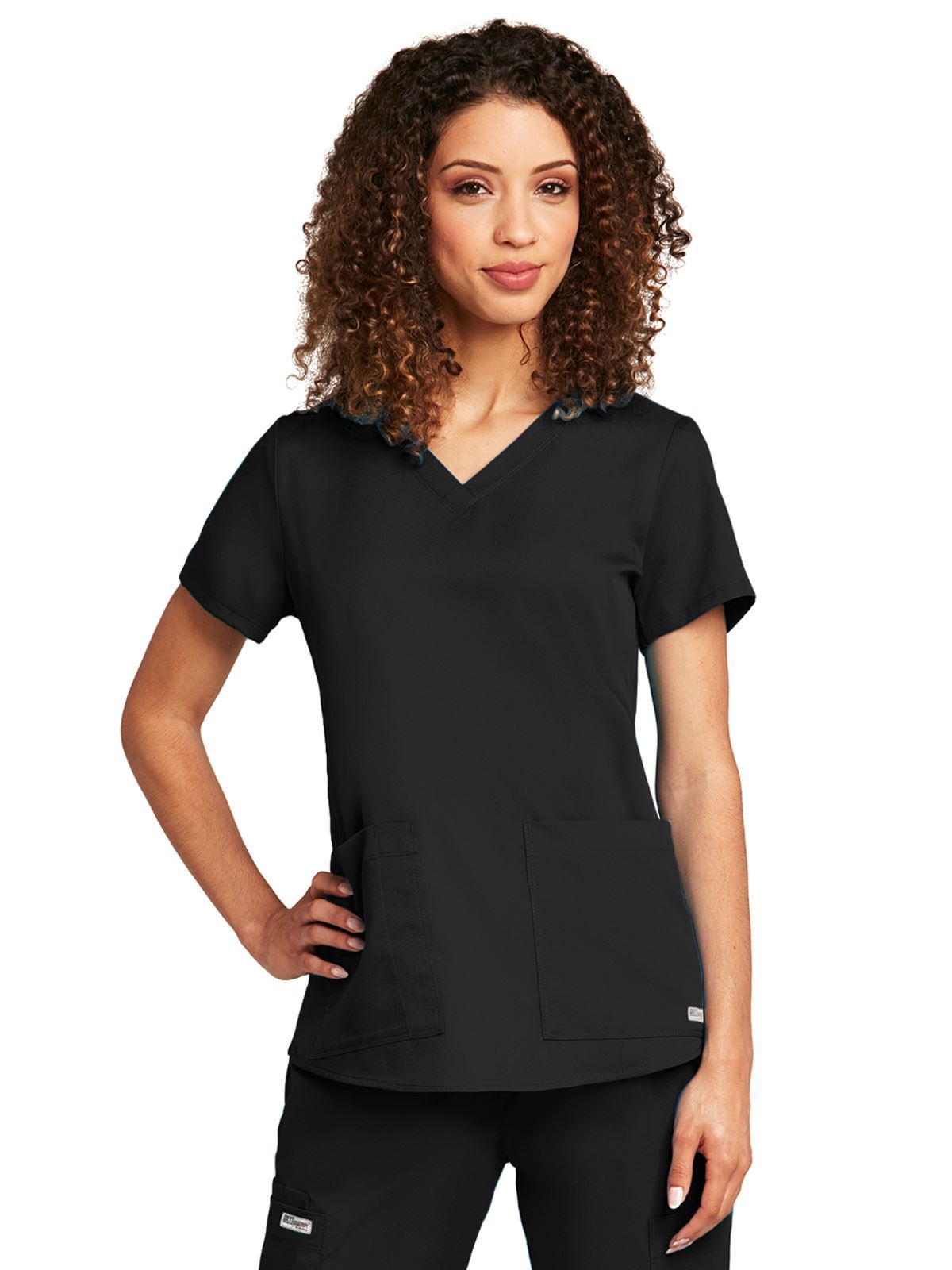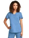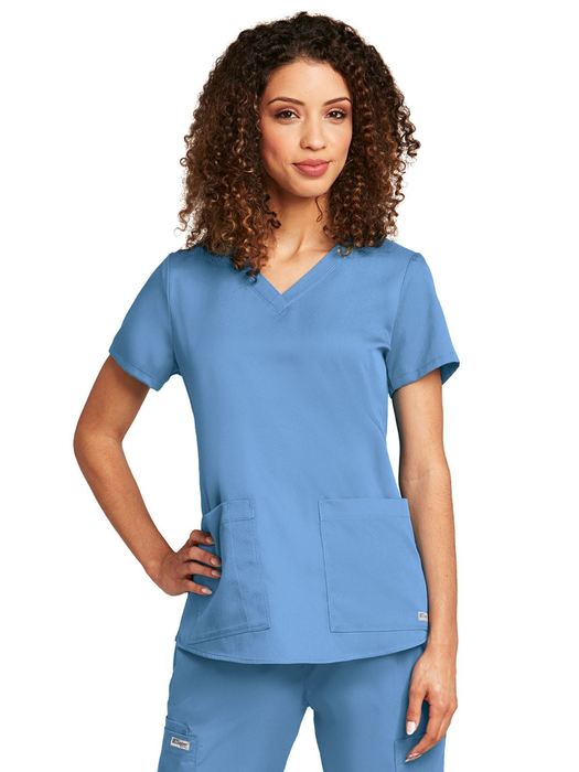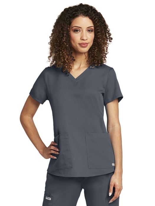 2 pocket missy fit v-neck top with added pen slot and shirred back yoke. Center back length: 26". Sizes: XS-5XL. Additional Charge for Sizes 2XL+. Fabric: 77% Polyester, 23% Rayon.
