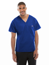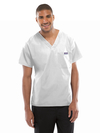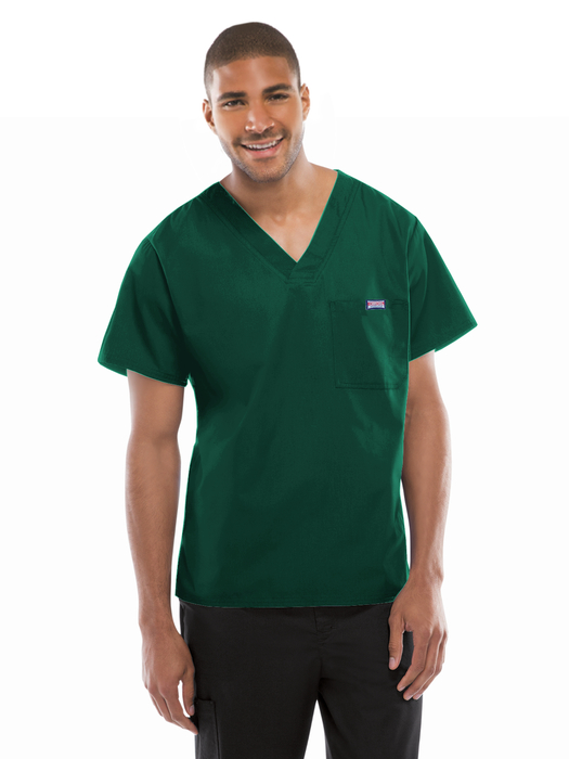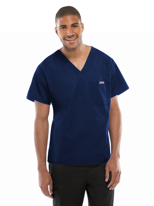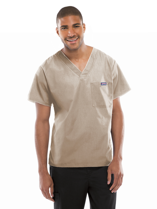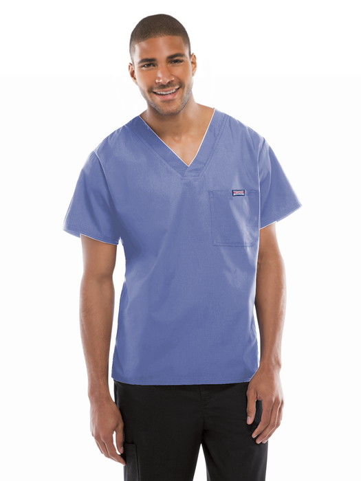 This men's V-neck top features a chest pocket with bartacked pencil slot, set-in sleeves, back yoke, side vents, and double needle detailing. Center back length: 29".Fabric: 65% Polyester, 35% Cotton with Soil Release.