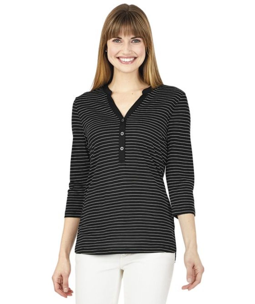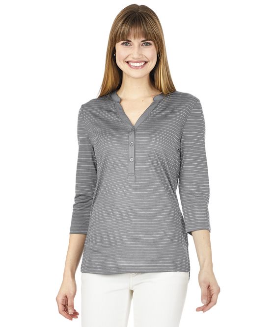 - Y-neck, three-button collar styling with double needle cover stitch for durability