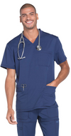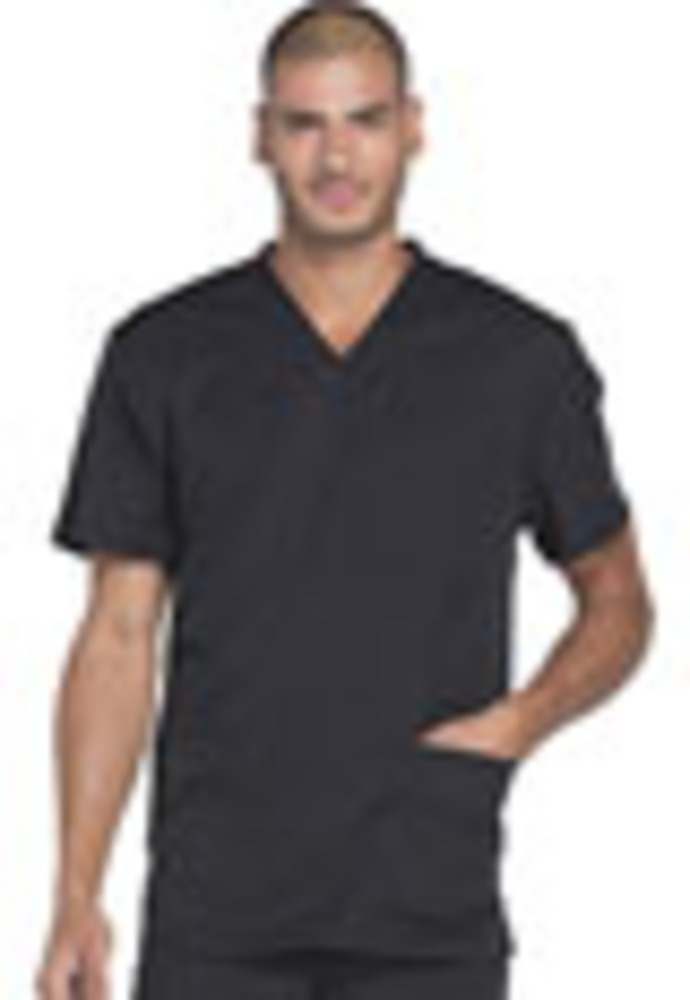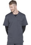 A Men's V-neck top features a knit collar, chest patch pocket with pencil slot, front welt pockets (the right with a hidden grommet for a headphone cable) and a back shoulder yoke. Also featured are a signature tonal heat-transfer logo, side vents and coverstitch detail throughout. Center back length: 30"