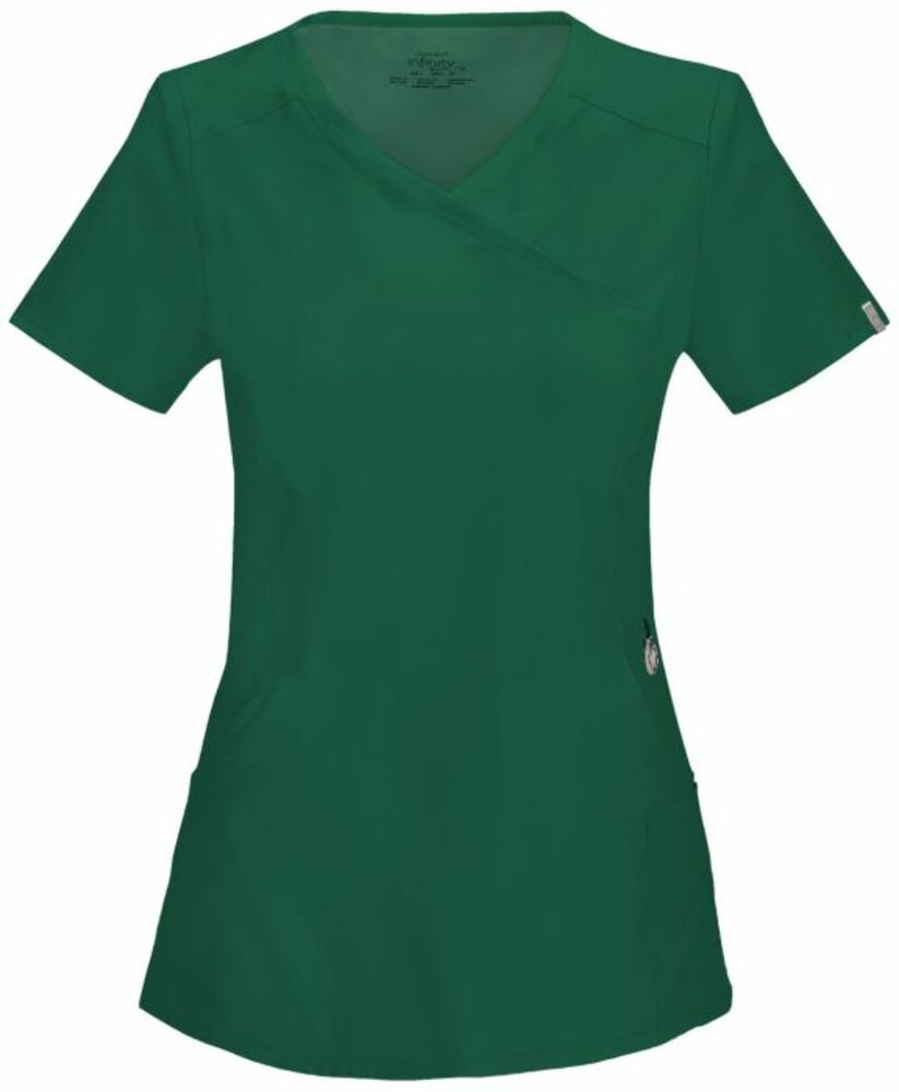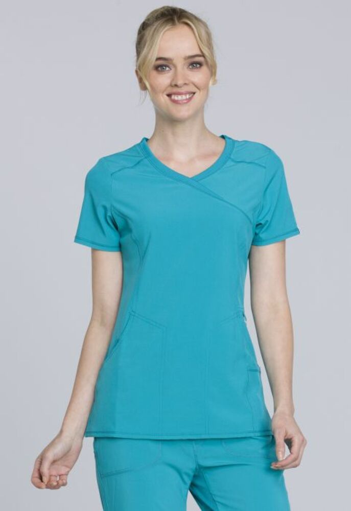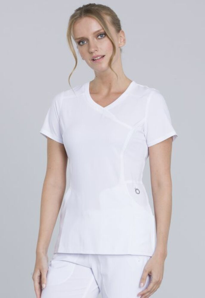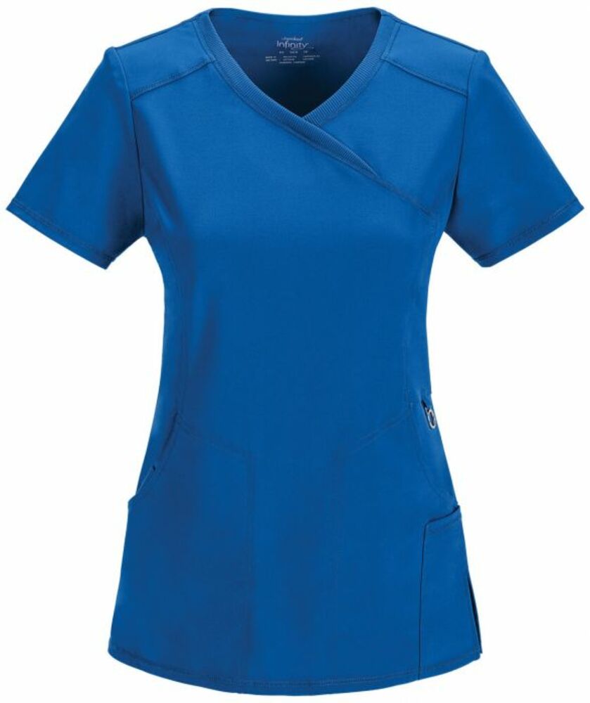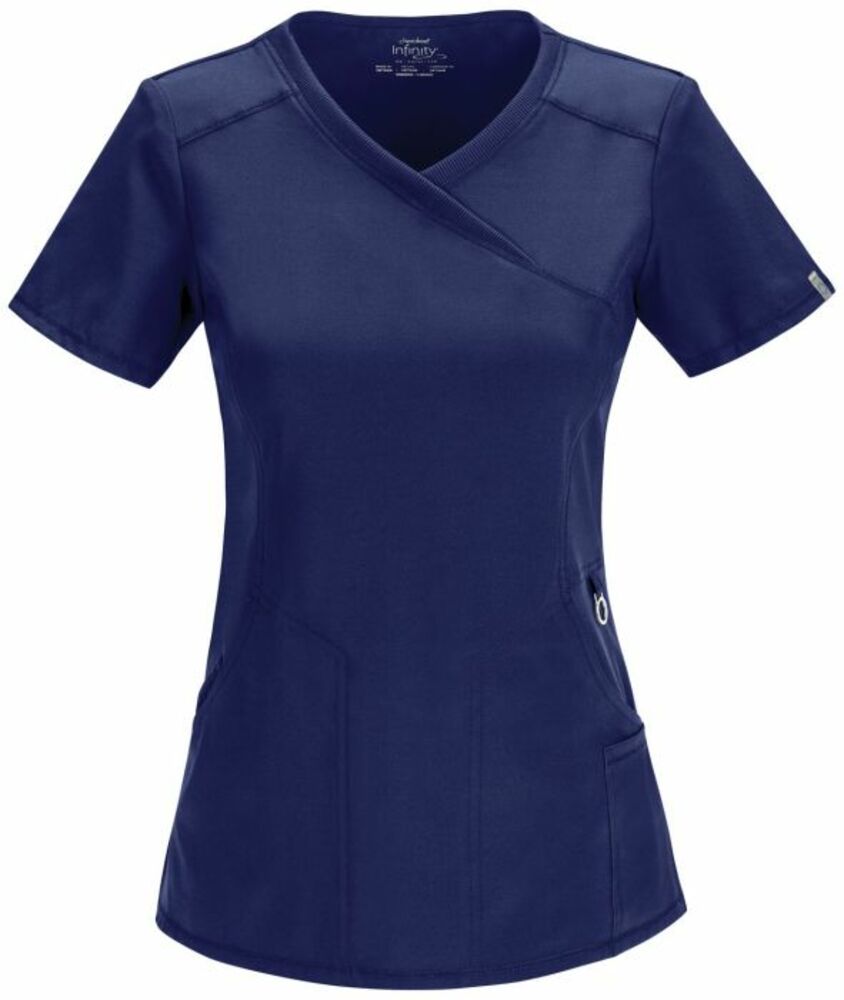 A Contemporary fit mock wrap top features two set-in front pockets, a logo O-ring above left pocket, left scissor pocket, one interior pocket, front and back princess seams, and side vents. Stretch rib knit at the center back panel gives this top its slimming shape and allows for extra movement and comfort. Center back length: 26". The comfortable stretch poplin fabric and super stretchy rib knit is the perfect combo for healthcare professionals.