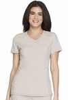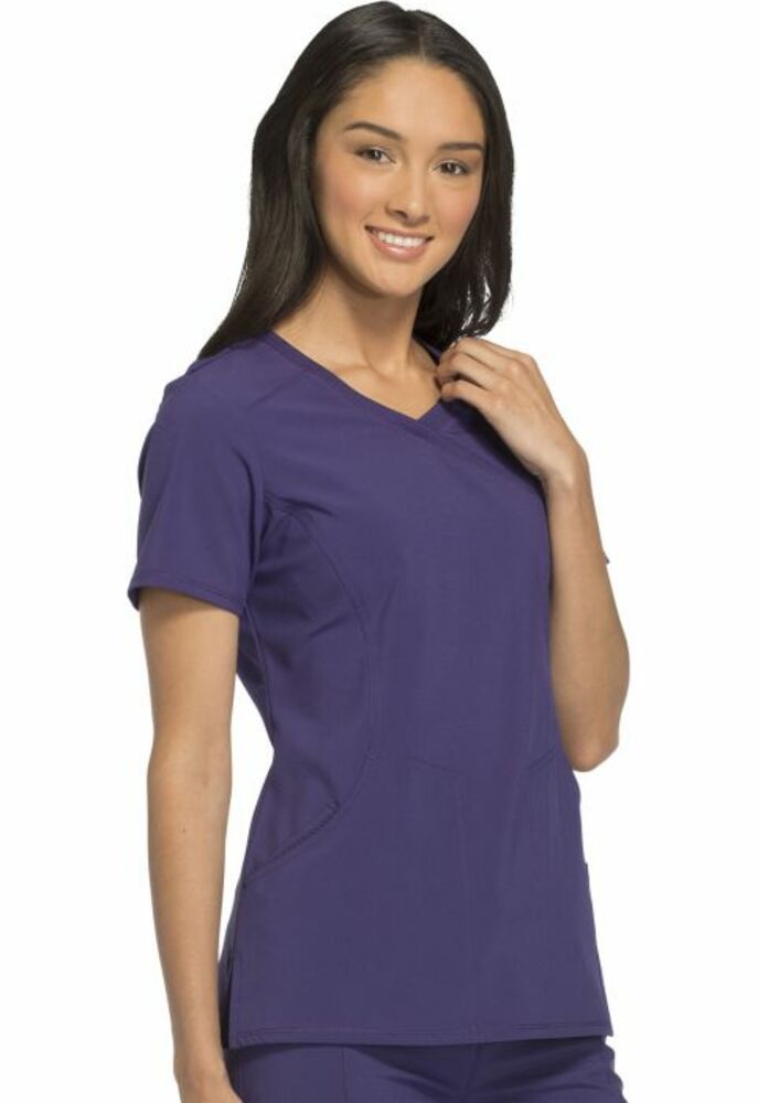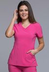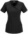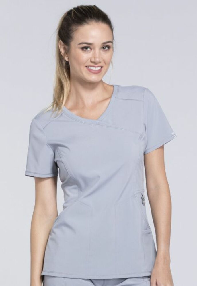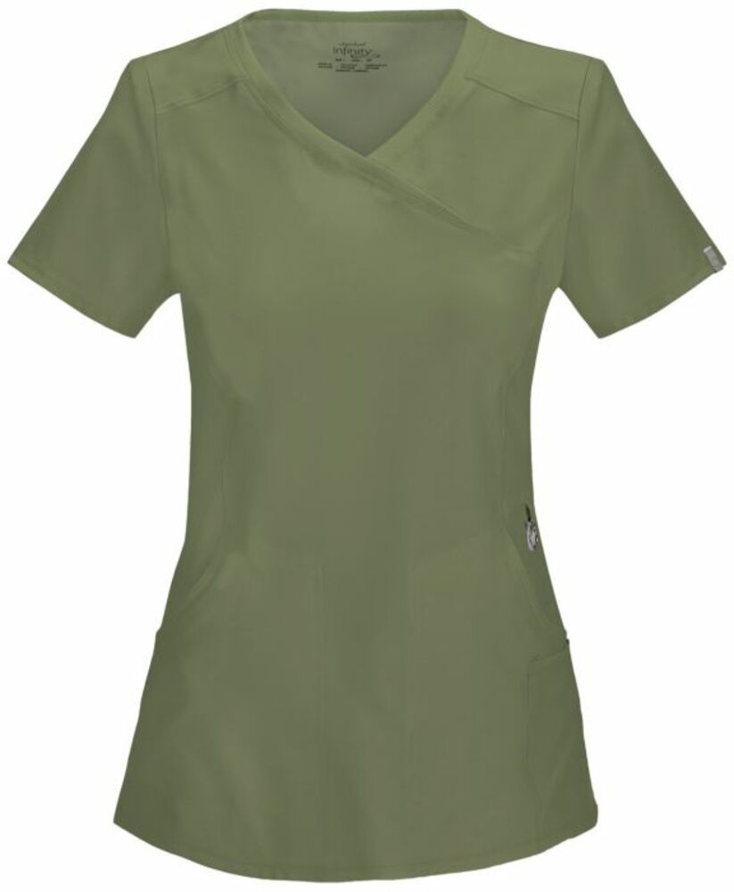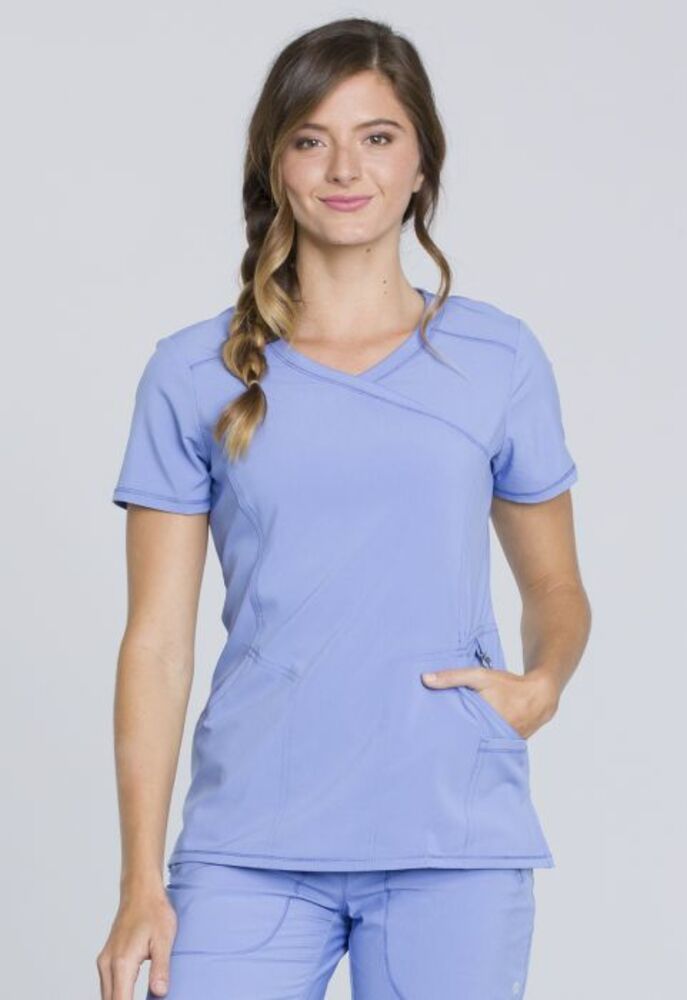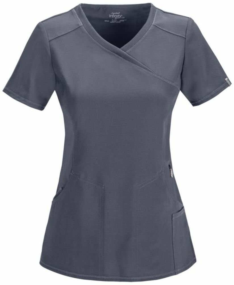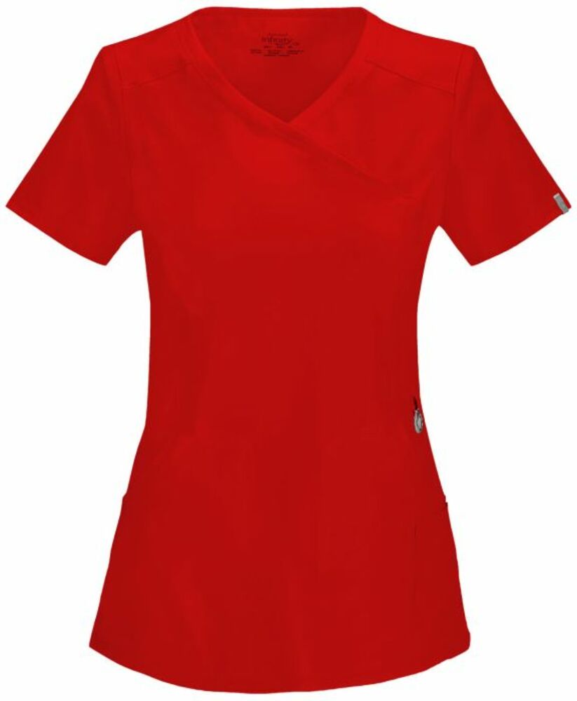 A Contemporary fit mock wrap top features two set-in front pockets, a logo O-ring above left pocket, left scissor pocket, one interior pocket, front and back princess seams, and side vents. Stretch rib knit at the center back panel gives this top its slimming shape and allows for extra movement and comfort. Center back length: 26". The comfortable stretch poplin fabric and super stretchy rib knit is the perfect combo for healthcare professionals.