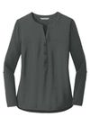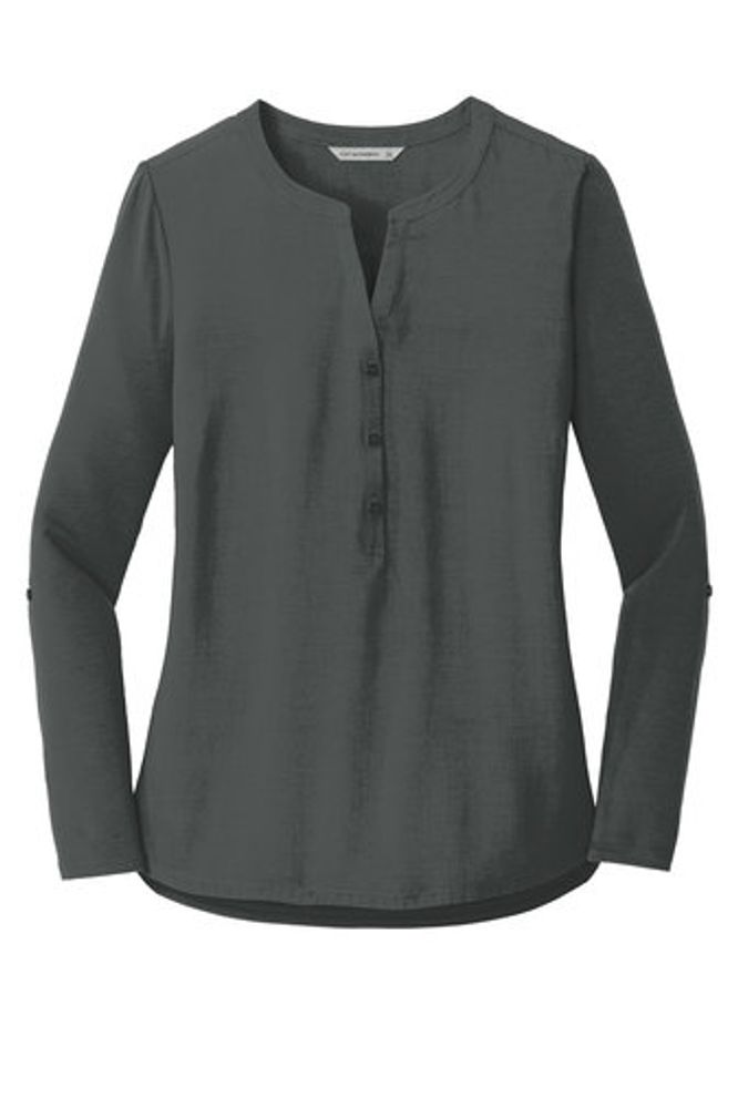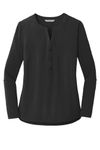 This soft, flowy tunic has professional edge with its woven front and knit back.