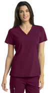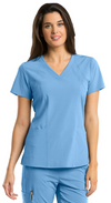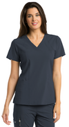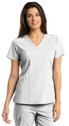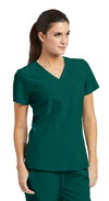 4-pocket v-neck with princess seaming and perforated panel details in front and back.